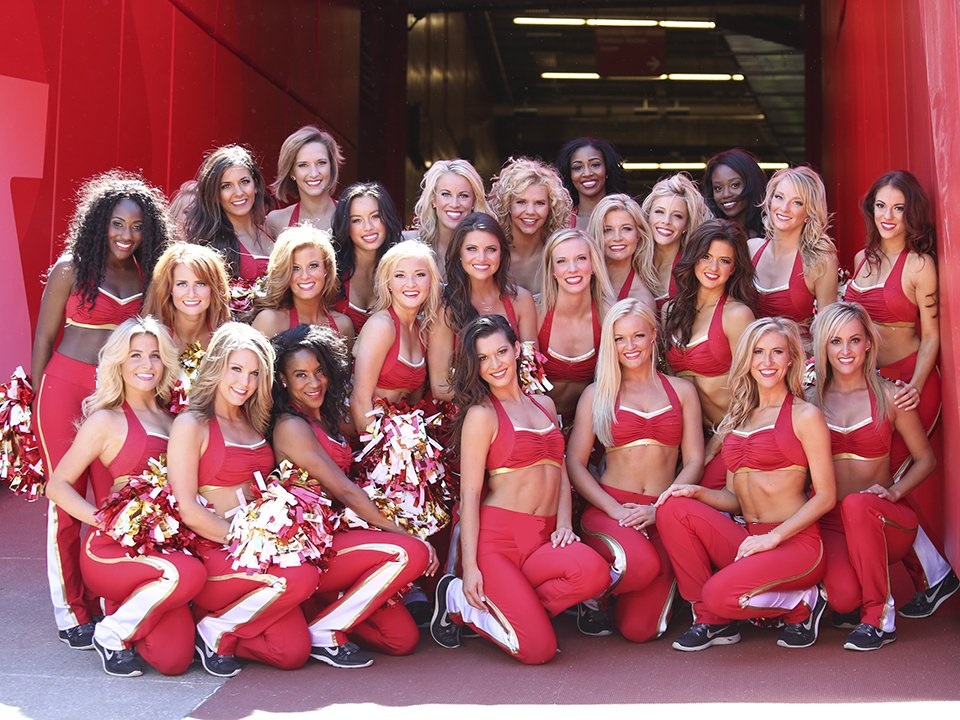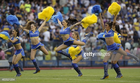 Cheerleaders from the WFL Cheer All Stars, Scandinavian Stars, Buenos Aires Blue Dogs, Dacusville Devils, London Falling, Old England Patriots, and Mexico Aztecs gather in this photo op at the 2015 opening ceremonies.